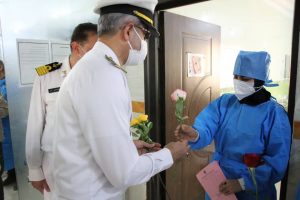 به گزارش هرمزگان من به نقل از روابط عمومی منطقه یکم امامت نداجا، امیر دریادار دوم آریا شفقت رودسری با همراهی هماهنگ کننده بهداشت و درمان نیروهای مسلح استان هرمزگان ناخدا یکم پزشک محمد افشین اردلان، با حضور سرزده در بیمارستان سیدالشهداء(ع) منطقه یکم امامت نیروی دریایی ارتش، از مدافعان سلامت تجلیل کرد و با حضور در بخش های بستری بیماران کرونایی ضمن عیادت از بیماران، در جریان روند بهبود آنها قرار گرفت.