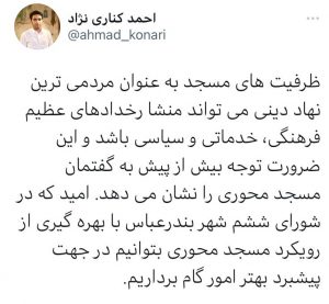 به گزارش هرمزگان من، احمد کناری نژاد با انتشار توئیتی در صفحه شخصی خود اظهار کرد: ظرفیت های مسجد به عنوان مردمیترین نهاد دینی می تواند منشا رخدادهای عظیم فرهنگی، خدماتی و سیاسی باشد و این ضرورت توجه بیش از پیش به گفتمان مسجد محوری را نشان می دهد امید که در شورای ششم شهر بندرعباس با بهره گیری از رویکرد مسجد محوری بتوانیم در جهت پیشبرد بهتر امور گام برداریم.