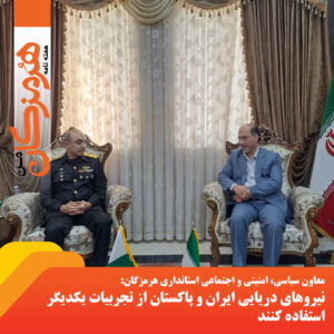 معاون سیاسی، امنیتی و اجتماعی استانداری هرمزگان،اشتراک تجربیات بین نیروهای دریایی ایران و پاکستان را عامل مهم هم افزایی و تقویت قدرت منطقهای دانست و تأکید کرد که کشورهای منطقه باید تأمین کنندگان اصلی امنیت در منطقه باشند.