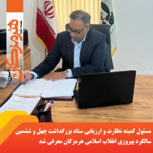 با عنایت به در پیش بودن چهل و ششمین سالگرد پیروزی انقلاب اسلامی لذا به موجب این ابلاغ جنابعالی به عنوان مسئول کمیته نظارت و ارزیابی ستاد بزرگداشت چهل و ششمین سالگرد انقلاب اسلامی استان هرمزگان منصوب می شوید.