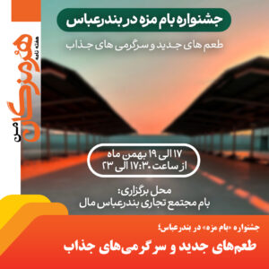 هرمزگان من-از ۱۷ الی ۱۹ بهمن ماه به مدت ۳ شب، جشنوارهای با عنوان «بام مزه» بر روی بام مجتمع تجاری بندرعباس مال برگزار میشود.