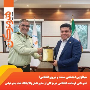 فرمانده انتظامی استان هرمزگان، با حضور در پالایشگاه نفت بندرعباس از بخشهای مختلف این مجموعه بازدید کرد و با اهدای لوح تقدیر از همکاریهای دکتر احمد هاشمی، مدیرعامل شرکت، قدردانی نمود.
