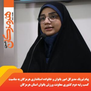 امیدوارم در آینده شاهد درخشش روزافزون ورزش بانوان استان هرمزگان باشیم.بار دیگر این موفقیت بزرگ را به جناب آقای مظفر مهری خادمی نسب، مدیرکل محترم ورزش و جوانان استان، سرکار خانم مرادی و کلیه دستاندرکاران تبریک عرض نموده و توفیقات روزافزون همه شما را از درگاه ایزد منان مسئلت مینمایم.