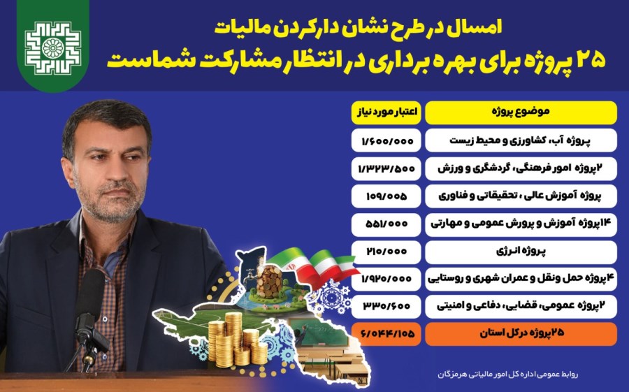 احمد مرادی با بیان اینکه در سال ۱۴۰۴ نیز طرح نشان دارکردن مالیات برای دومین سال اجرا می شود گفت: امسال در استان هرمزگان ۲۵پروژه استانی به ارزش بیش از ۶ هزارمیلیارد ریال در امورآموزشی، ورزشی، آبرسانی و …در نظر گرفته شده است افزود: در سال گذشته در این طرح جهت تامین اعتبار پروژه های استان هرمزگان مبلغ ۲ هزار ۷۸۸ میلیارد ریال در نظر گرفته شد و تعداد زیادی از پروژه ها در حوزه آموزش، ورزش، سلامت، آبرسانی و … به بهره برداری رسید و با توجه به اینکه امسال این رقم با افزایش قابل توجهی در نظر گرفته شده است امیدواریم پروژه های تعیین شده در این طرح با مشارکت مودیان مالیاتی بطور کامل تامین اعتبار گردد همچنین خواستار همکاری دستگاههای اجرایی با اداره کل امورمالیاتی هرمزگان جهت ترویج فرهنگ سازی در خصوص این طرح مهم ملی شد