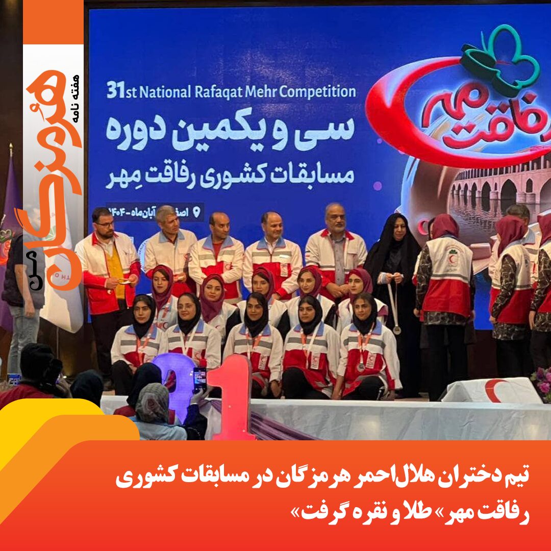 هرمزگان من- تیم اعزامی دختران جمعیت هلالاحمر استان هرمزگان در سیویکمین دوره مسابقات کشوری «رفاقت مهر» موفق به کسب مدال طلای رشته آتلبندی و نقره رشته احیای قلبی و ریوی (CPR) شد.