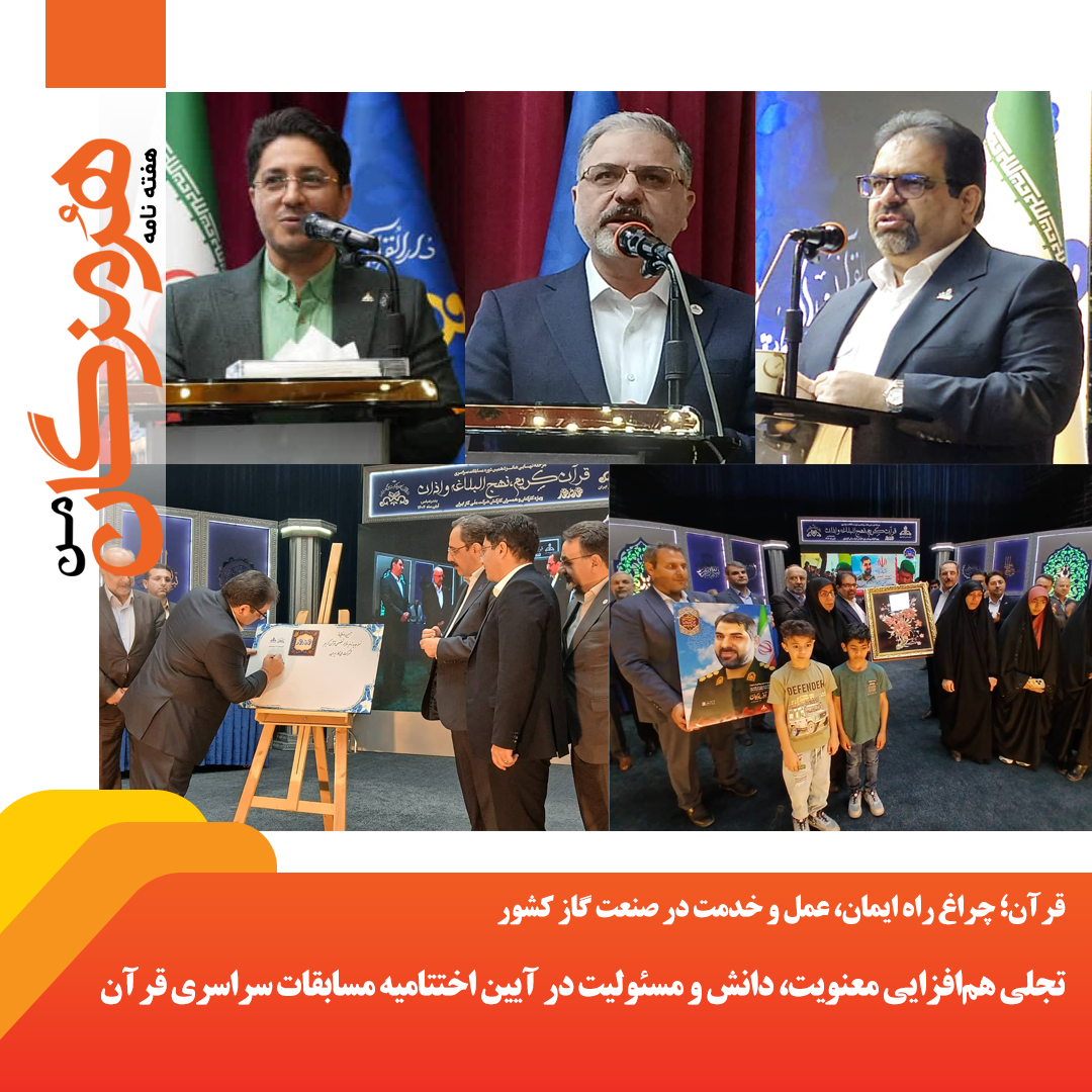 هرمزگان من- آیین اختتامیه شانزدهمین دوره مسابقات سراسری قرآن کریم کارکنان شرکت ملی گاز ایران با حضور دکتر سعید توکلی، معاون وزیر نفت و مدیرعامل شرکت ملی گاز ایران، دکتر طه کبیری، رئیس دارالقرآن و دبیر شورای فرهنگی شرکت ملی گاز ایران، و مهندس حمیدرضا بنیاسدی، مدیر منطقه شش عملیات انتقال گاز، در فضایی سرشار از معنویت، همدلی و نور قرآن برگزار شد.