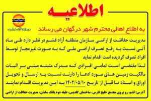 مدیر حفاظت از اراضی سازمان منطقه آزاد قشم گفت: با توجه به رویکرد جدید سازمان مبنی بر افزایش تعامل با مردم و پیشگیری از برخورد سلبی، از این پس، یک ماه قبل از اقدام برای رفع تصرف اراضی به ساکنان شهرها و روستاهای جزیره اعلام می شود که برای اثبات مالکیت اراضی به سازمان مراجعه کنند.