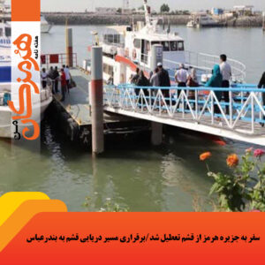 رئیس کمیته حمل و نقل دریایی ستاد اجرایی خدمات سفر قشم اعلام کرد: هم اینک فعالیت نقل و انتقال گردشگران جزیره قشم در دو مسیر دریایی بندر شهید ذاکری قشم به مقصد بندرعباس و از بندر شهید حقانی به مقصد شهر قشم برقرار است.