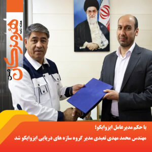 به گزارش مرکز ارتباطات و امور بین الملل ایزوایکو، طی حکمی از سوی دکتر سلمان ضربی مدیرعامل و نایب رئیس هیأت مدیره مجتمع کشتی سازی و صنایع فراساحل ایران ، مهندس محمد مهدی تعبدی به عنوان مدیر گروه طراحی و ساخت سازه های دریایی و فراساحلی منصوب شد.